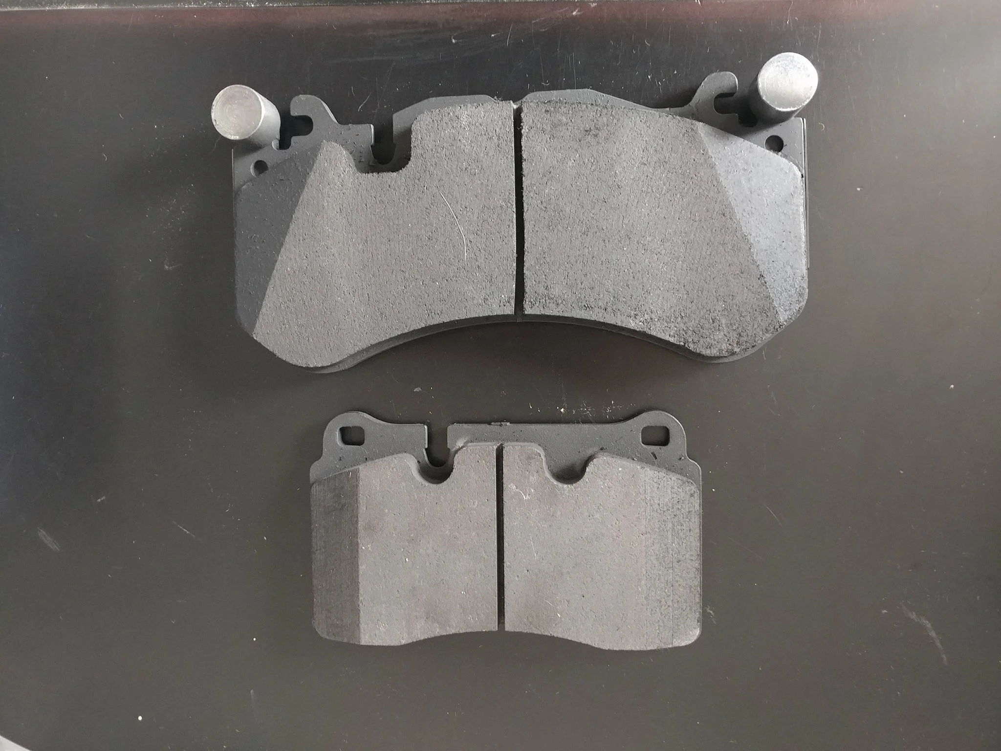 The V8 Vantage S introduced larger 6-piston calipers with 380mm rotors in the front, with a likewise much larger front brake pad. In early 2012, the standard V8 Vantage got the same front brakes (but with lower cost rotors rather than the pricey 2-piece ones of the V8 Vantage S). The picture below shows the 6-piston front pad (top) compared to the earlier 4-piston front pad (bottom) that it replaced (both are new Porterfield R4-S pads).
