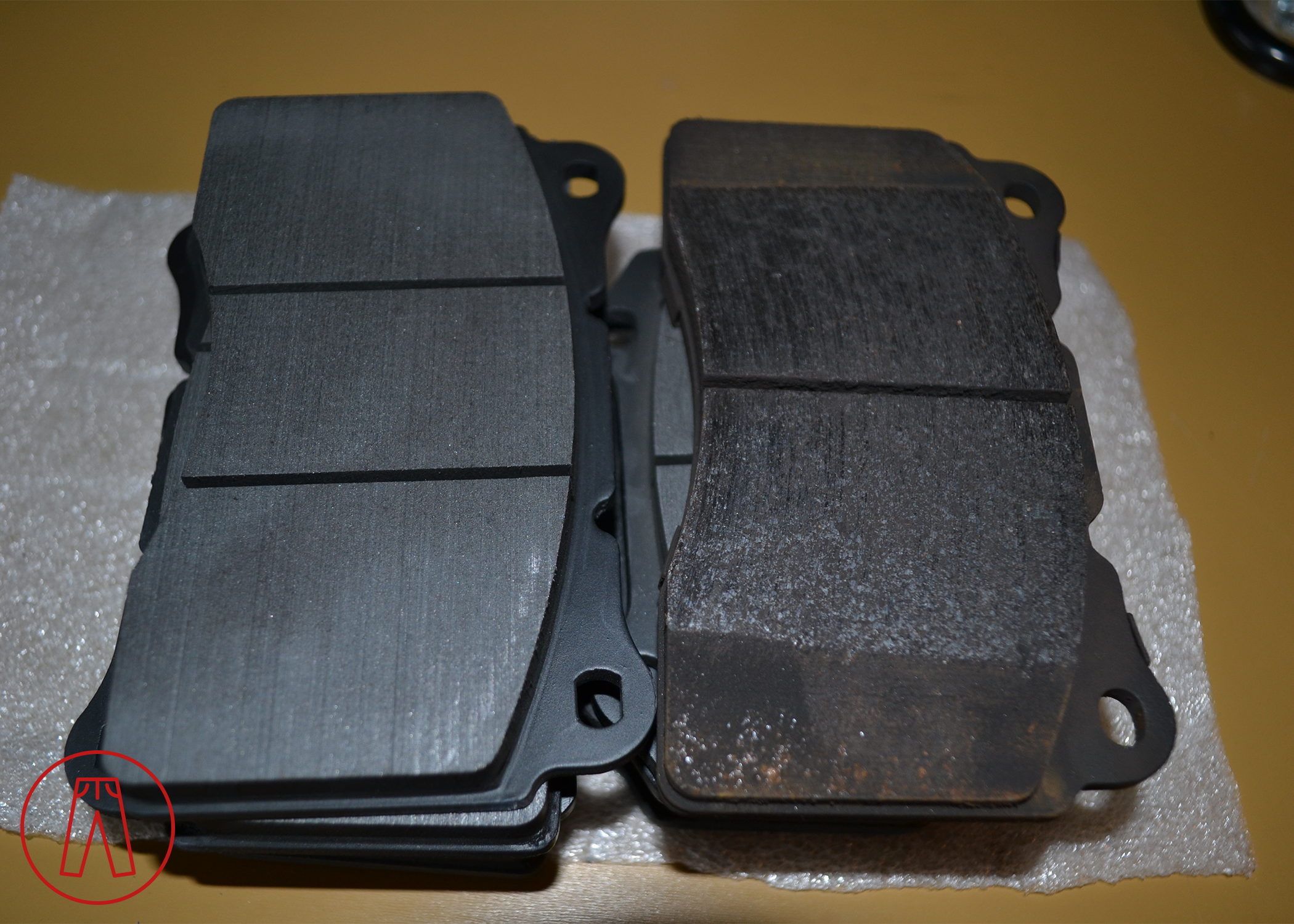 Granted, the chamfering on the pad on the right (a used Porterfield R4-S) is pretty aggressive as this pad is made with normal street driving in mind. The pad on the left (a new Porterfield R4) is made without chamfering because it’s a track/race pad that needs as much performance as possible, so maximum surface area is maintained.