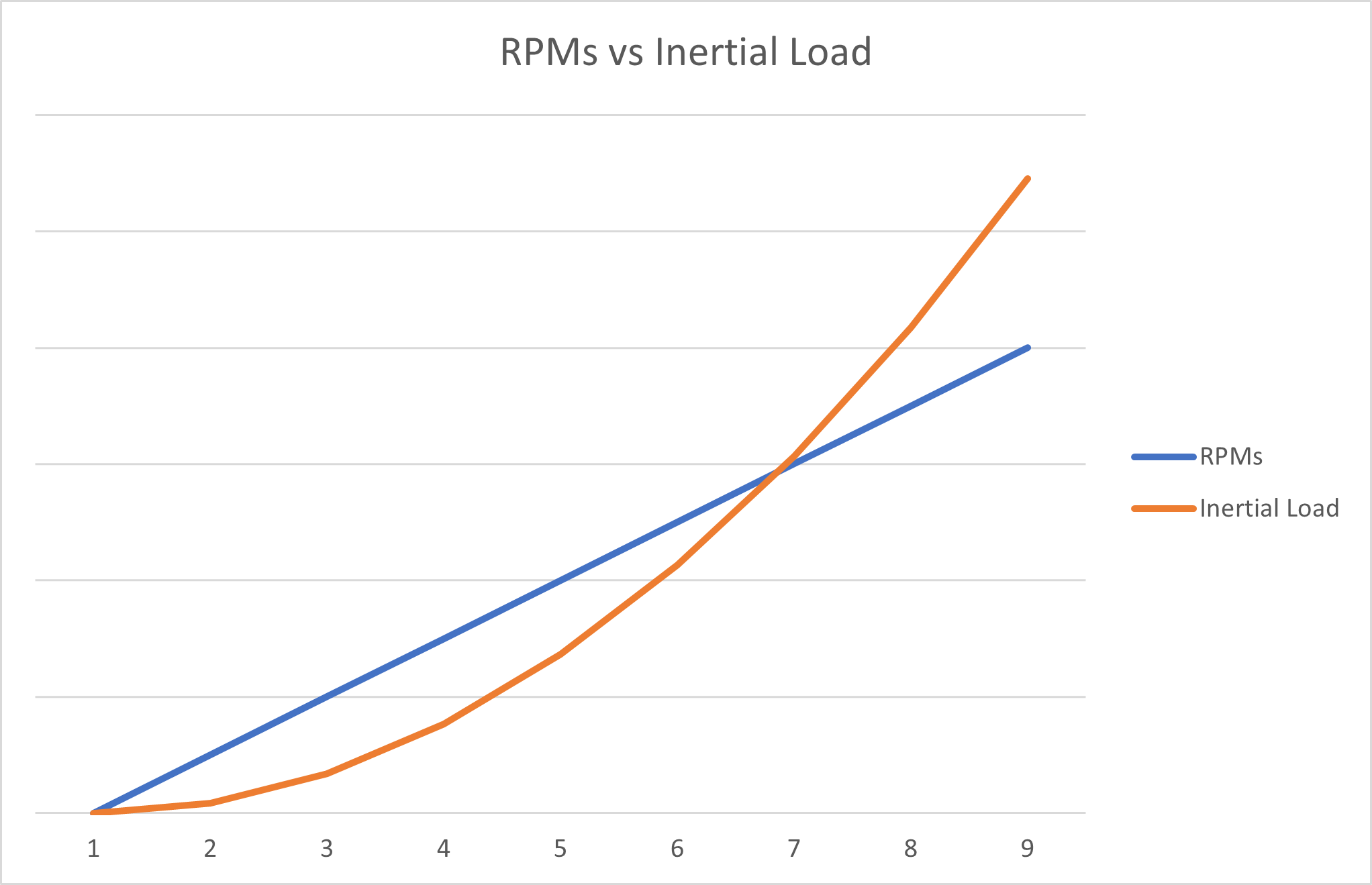 The chart shows simplified data using the same calculations, measurements, values, etc, as described in this article. The intersection and terminus points of the RPM and Inertial Load lines are entirely arbitrary. I overlaid them the way I did to show that a steady/linear increase in engine RPMs (the blue line) equates to an exponential increase in inertial load of the engine’s internal components (the orange line). This chart is meant only to show the relationship between RPMs and Inertial Load, not actual values.