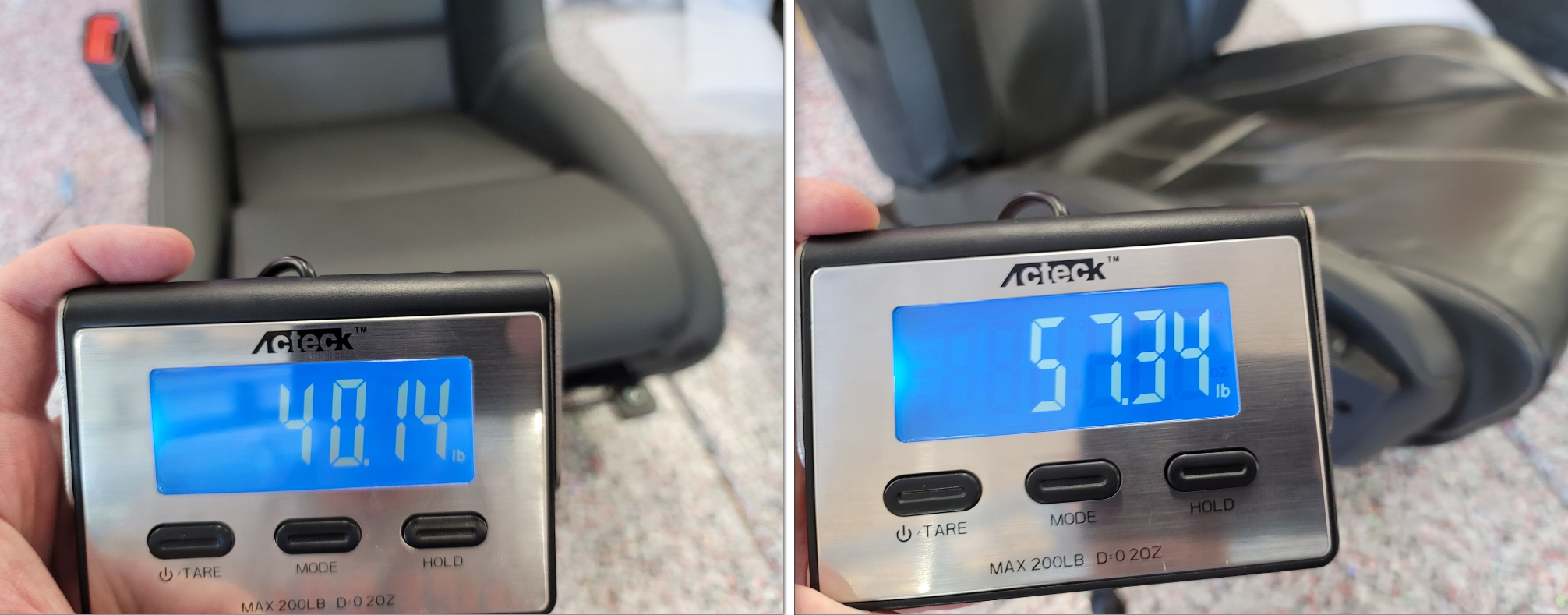 Being a weight loss junkie, I knew this would help me reach my lightweight goals. The pic below shows a comparison but the Cobra weighs more than it would as it has the seat belt receiver attached while the factory seat did not when I was weighing them (woops). So, the weight difference is realistically a little over 18 lbs (8.2 kg) per seat.