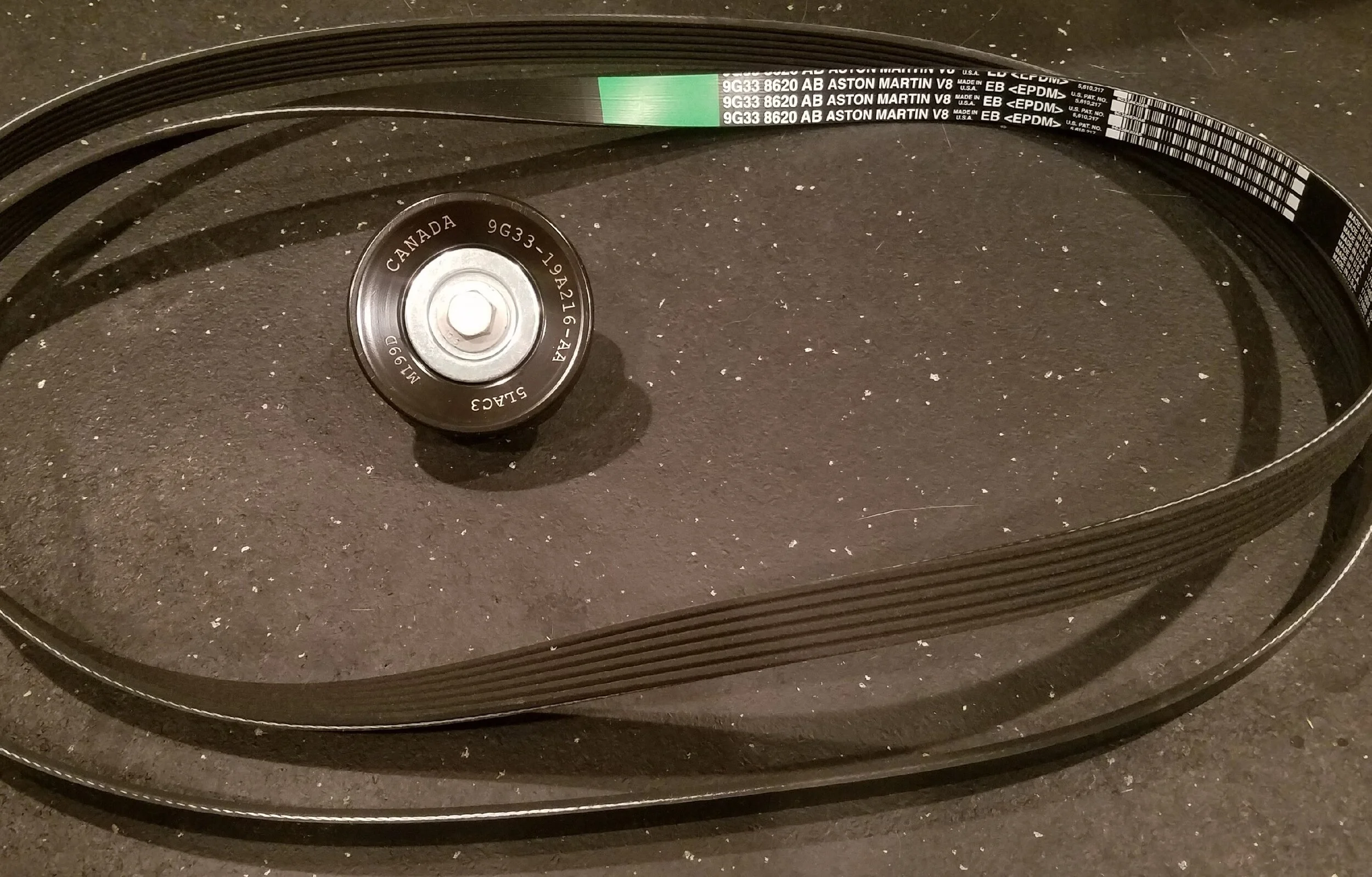 The front end accessory drive (FEAD) belt of the V8 Vantage can have a bit of a “chirp” when the engine is cold. Aston Martin has introduced updated versions of both the FEAD belt itself and one of the idler assemblies (AKA “idler pulley”). However, these were introduced at different times so some cars may have one updated part but not the other. To fully fix the chip caused by the older parts, both the FEAD belt and idler pulley must be replaced with the updated versions.