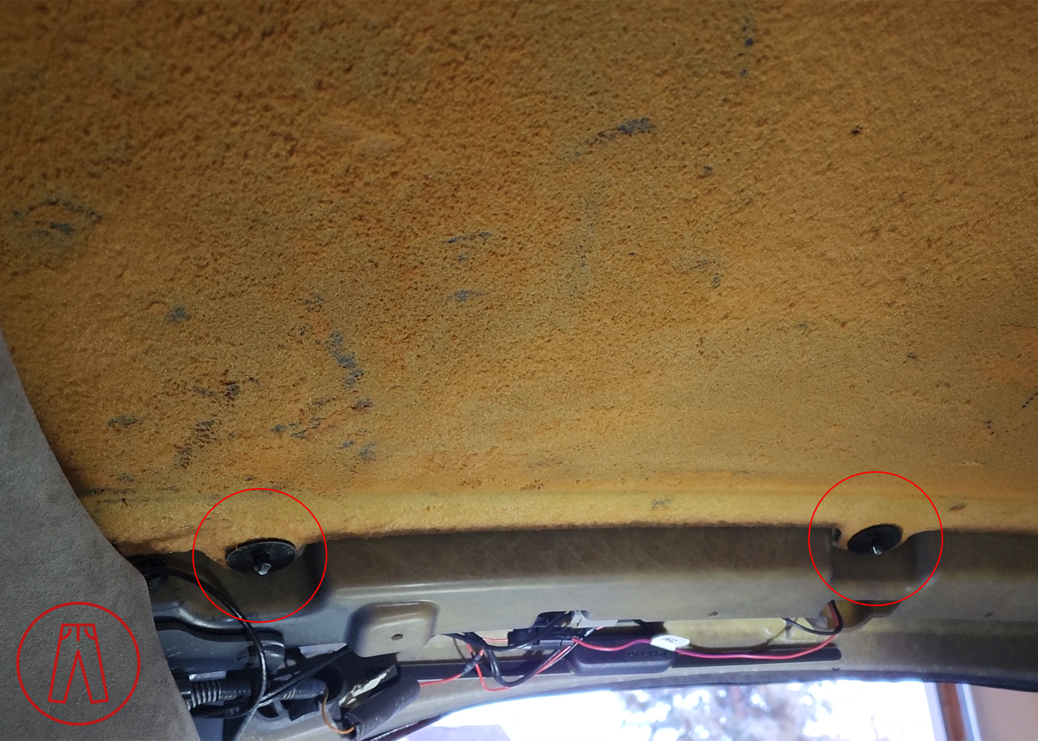 Remove the two T15 Torx bolts (one on each side) of the rear headliner header trim. Each one is located near the cabin brace bars, as seen below.