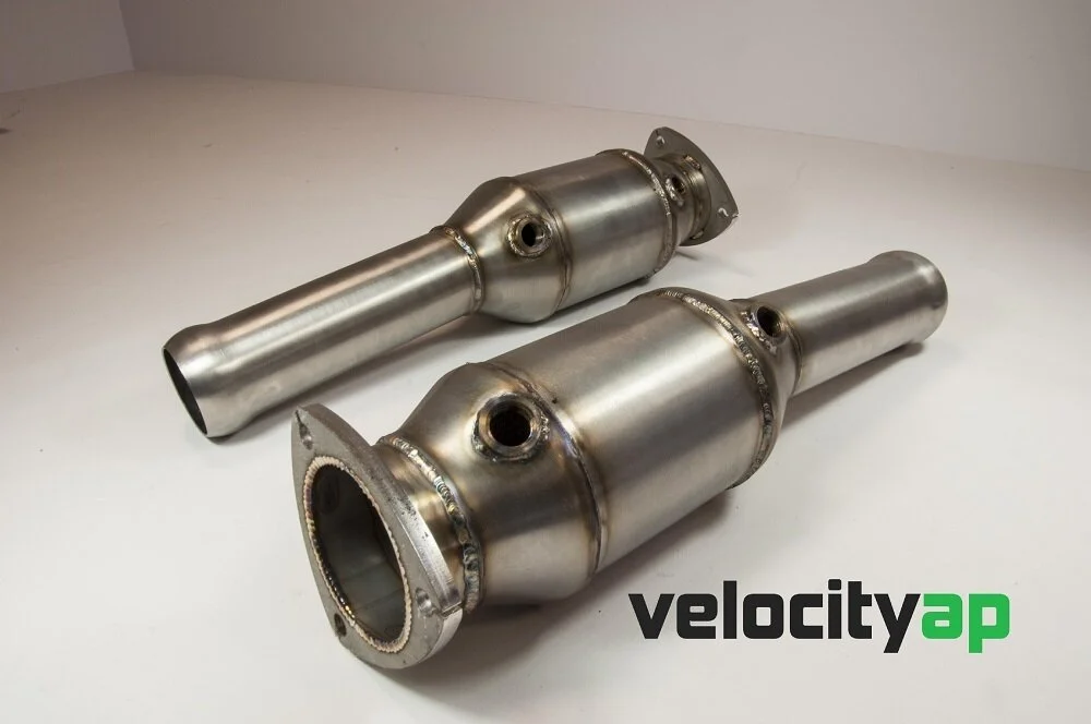 The cats (or cat delete pipes) are specific to each side, so make sure you're putting the correct one in each place or they won't line up properly. You can see in the pic below that VelocityAP identifies each side with "LHS" (left-hand side) and "RHS" (right-hand side). Keep in mind, the side is based on the driver's perspective. In the US, we have left-hand drive (LHD) cars because the driver is on the left-hand side of the car while driving the car. The cars in the UK are right-hand drive (RHD). So, the LHS catalyst goes on the driver's side of the car in a US car.