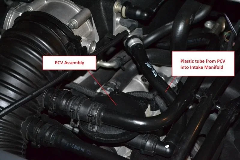 Remove the hard plastic tube going from the PCV to the intake manifold. You'll notice that one side of the quick-release on the tube at the PCV side is pointed down. I've found that a long, flat-head screwdriver can be used to push in that side while using your finger to push in the top side.