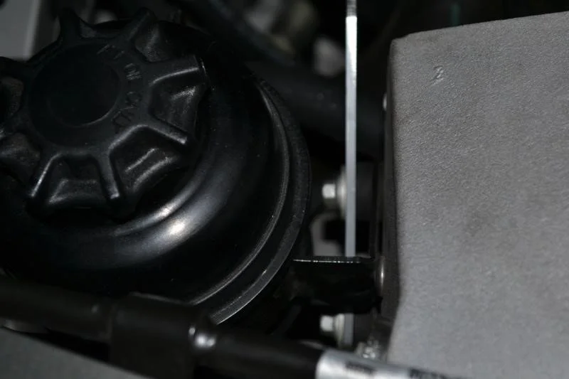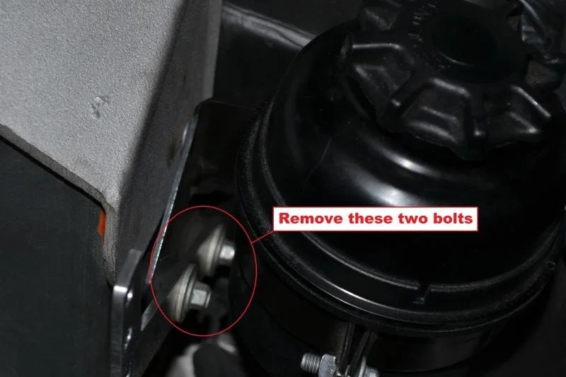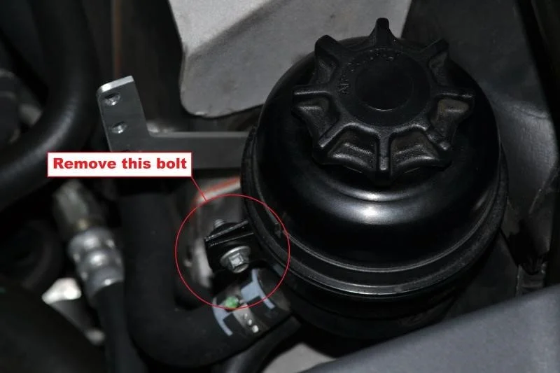 Move the power steering fluid reservoir to the side so you can access the next two bolts. DO NOT disconnect the hoses from it! Use the 8mm socket to remove those two bolts.