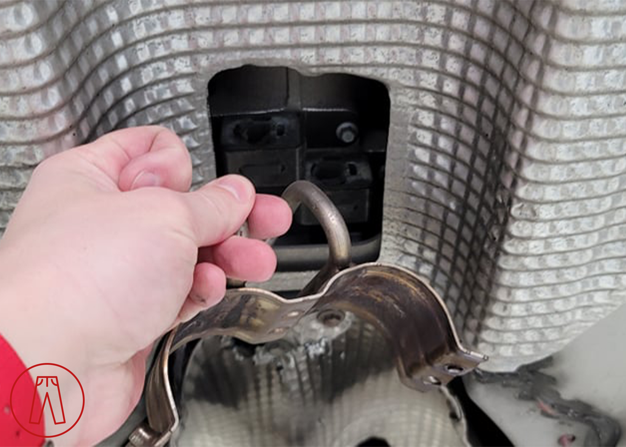 The mid-pipes use hangers to support their weight in addition to being held in place at each end. The hangers slot into bushings that are attached to the underside of the chassis, which you can see in the cut-out portion of the heat shield in the picture below.