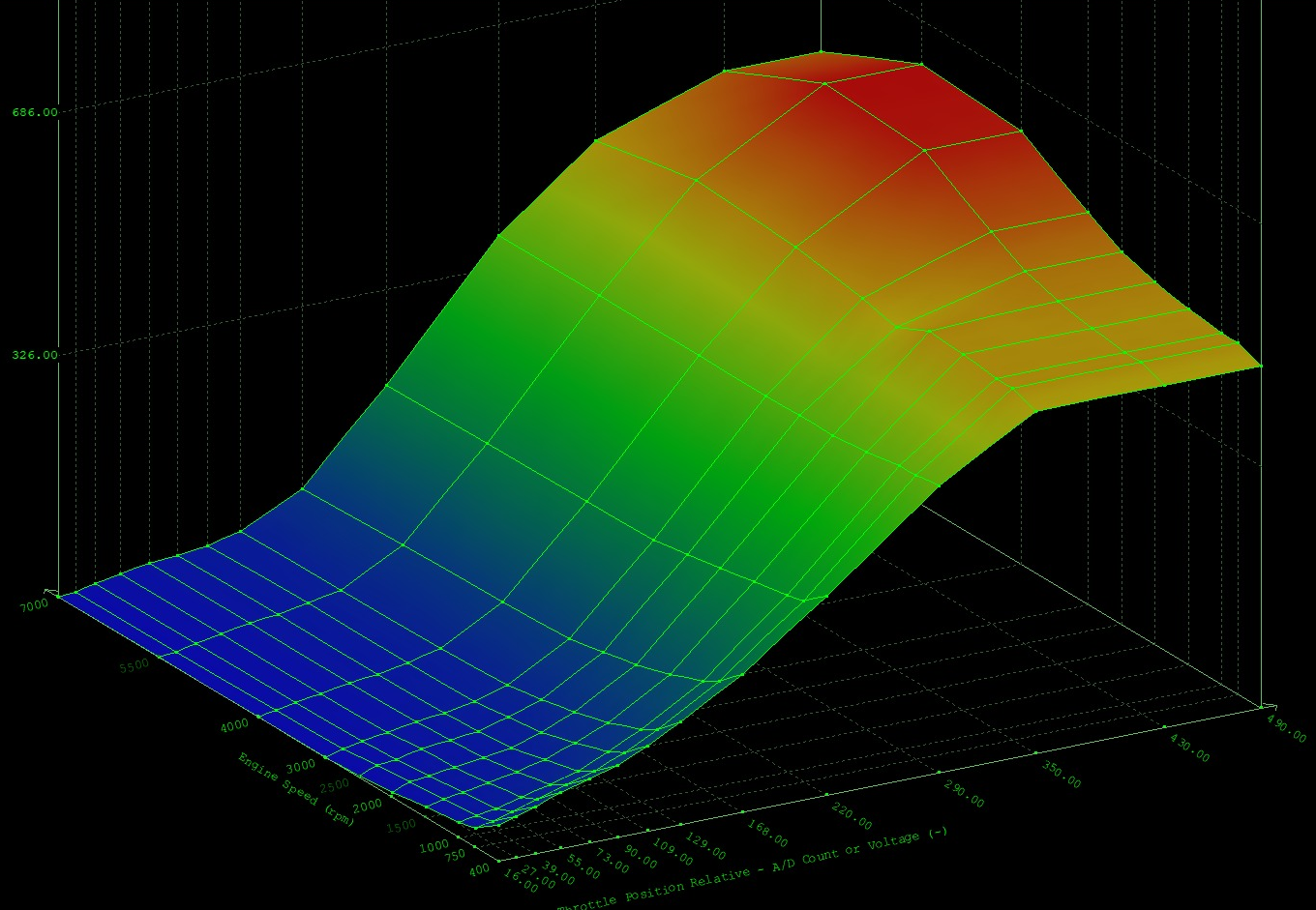 You can see that not only is there a complete lack of linearity on the graph, it’s also a 3D mapping - not a simple X:Y axis. So, let's put this concept into very round, fictional numbers to make this easy to understand. Keep in mind, actual throttle mapping is a lot more complicated than the simple examples we’ll use, as seen in the images above. Case in point, that chart and graph mapping show torque figures, not throttle body valve positioning - output targets aren’t even throttle body valve positions at all. It’s a quick reminder that it’s a very different system than the direct-input drive-by-cable setup.